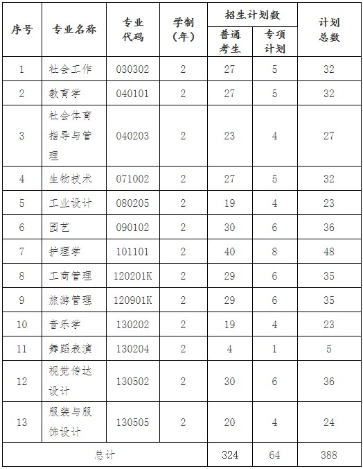 普通考生和专项计划考生报考专业应与所学专业相同或相近(以附件1为准)。我校社会体育指导与管理、护理学、视觉传达设计、服装与服饰设计4个专业招收退役大学生士兵,考生报考对应的专科专业与普通考生一致。退役大学生士兵招生计划将通过湖北省高等学校普通专升本报名平台于志愿填报前公布。